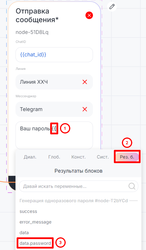- To send a password to a user, use the Send message* block. Enter two curly braces in the text box, click Block results and select the result "data.password" of the One-time password generation block.