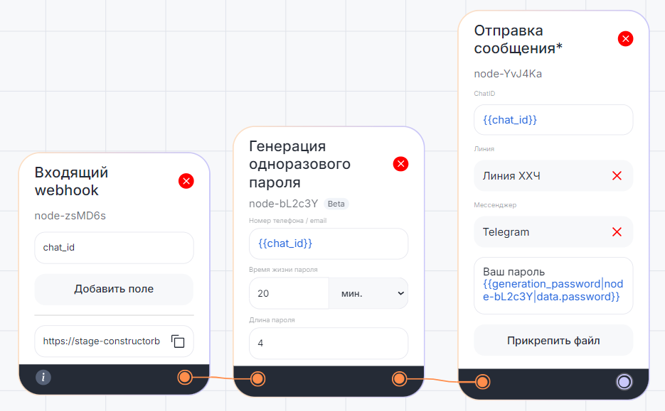 The user enters the phone number into the registration form on the site. The Incoming webhook block will pass the information to the chatbot, the One-time password generation block will create a password, and the Send message* block will send it to the user in messenger.