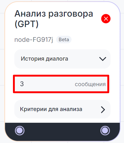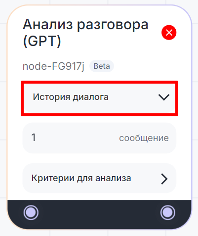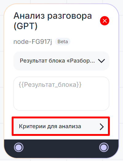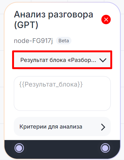 The "Conversation Analysis (GPT)" block analyzes voice files or messages with ChatGPT, checks for compliance with specified criteria and transmits the result. It can be used, for example, to analyze dialogues of managers with clients. The block can parse the dialog history or use the results of the "Voice File Parsing (GPT)" block.