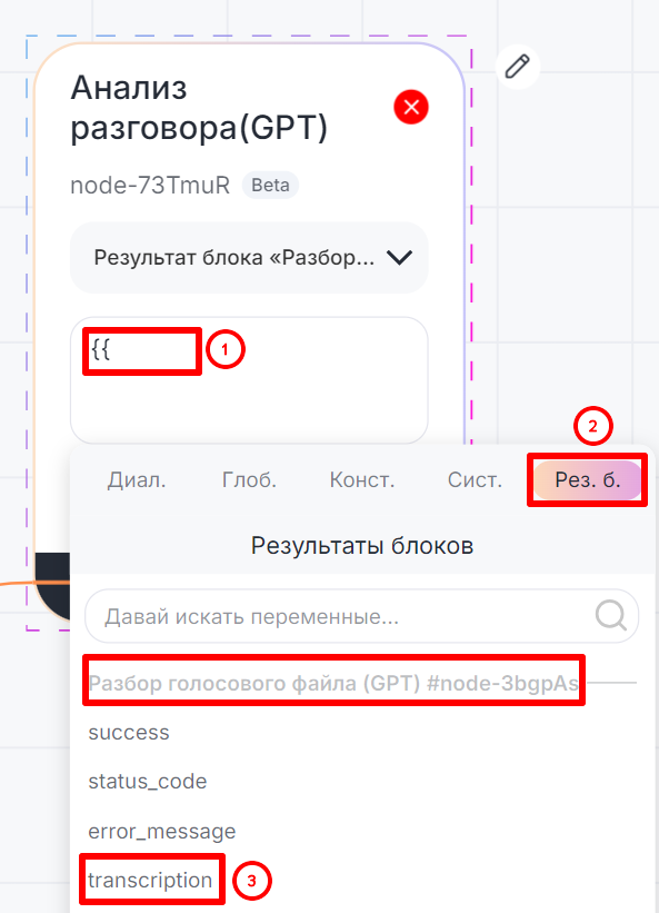 Enter the result of the Voice File Parsing block in the text box. To do this, enter two curly braces "{{", select "Block Result" - "Voice File Parsing (GPT)" -- "transcription".