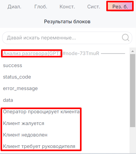 8. The results of the analysis are stored in variables that correspond to the specified criteria - you can see them in the block results. See the Block Results article for more information about using block results.