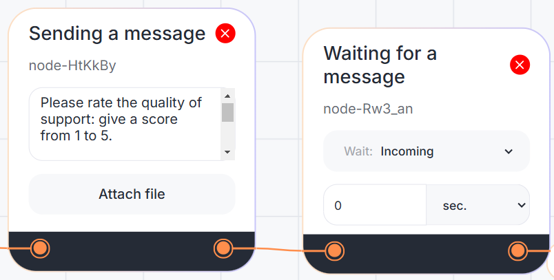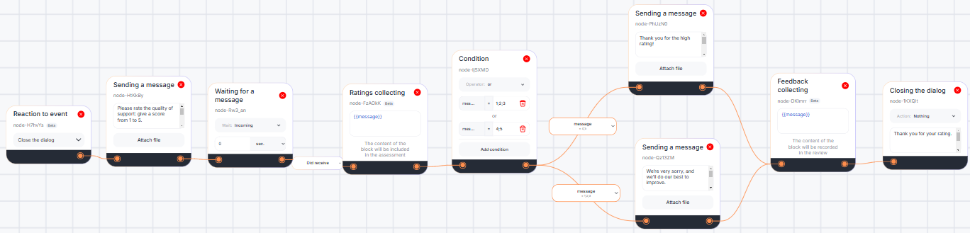 The block can be used, for instance, in a technical support scenario. After the dialog is closed, the bot will send a message to the client requesting a rating and save the response in the "Feedback" field within the "Metrics" section using the "Rating Collection" block. Depending on the given rating, an appropriate follow-up message will be sent. Then, the bot will ask the client to provide detailed feedback on the support service and save it in the "Feedback" field within the "Metrics" section using the "Feedback Collection" block.