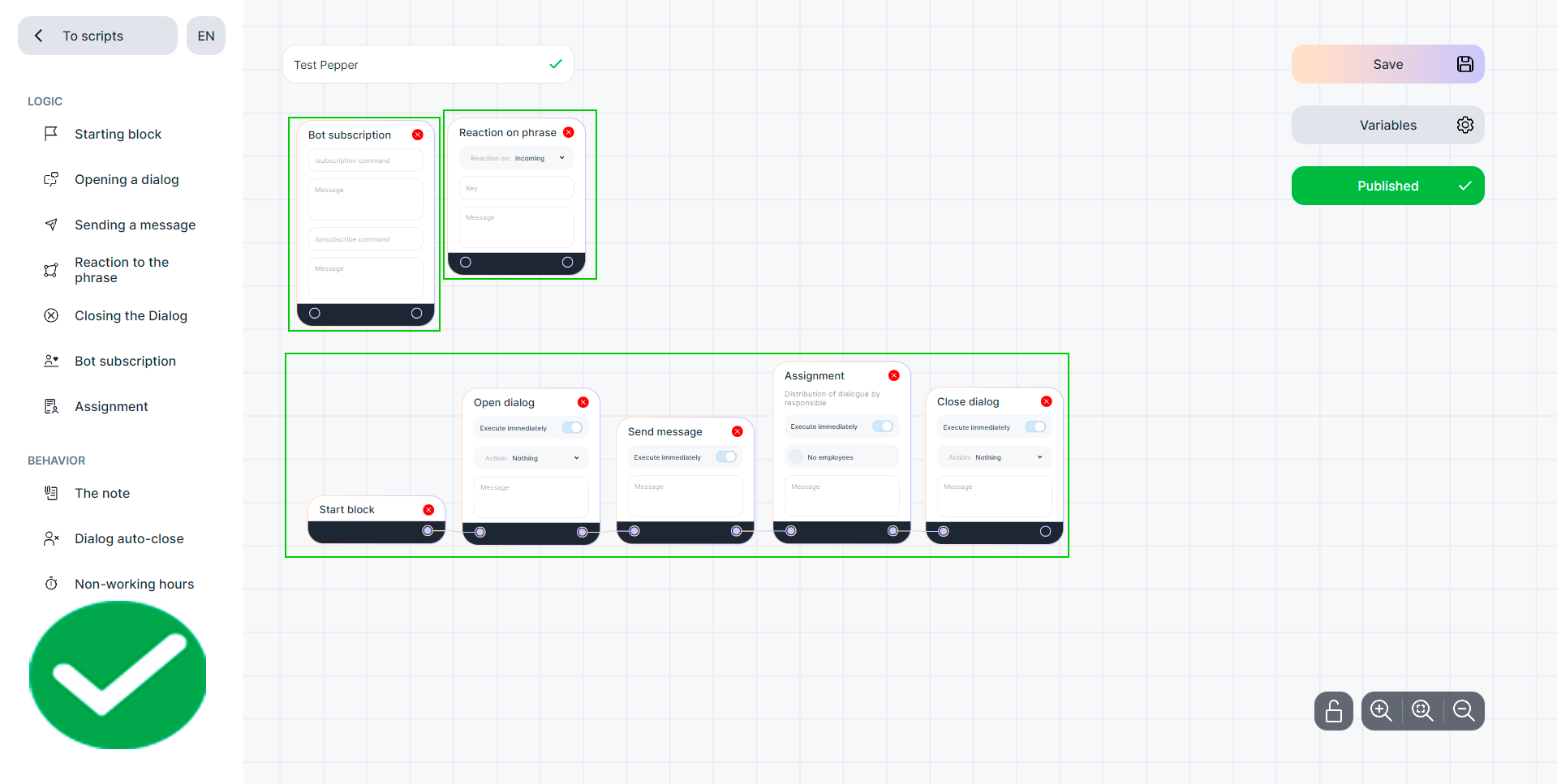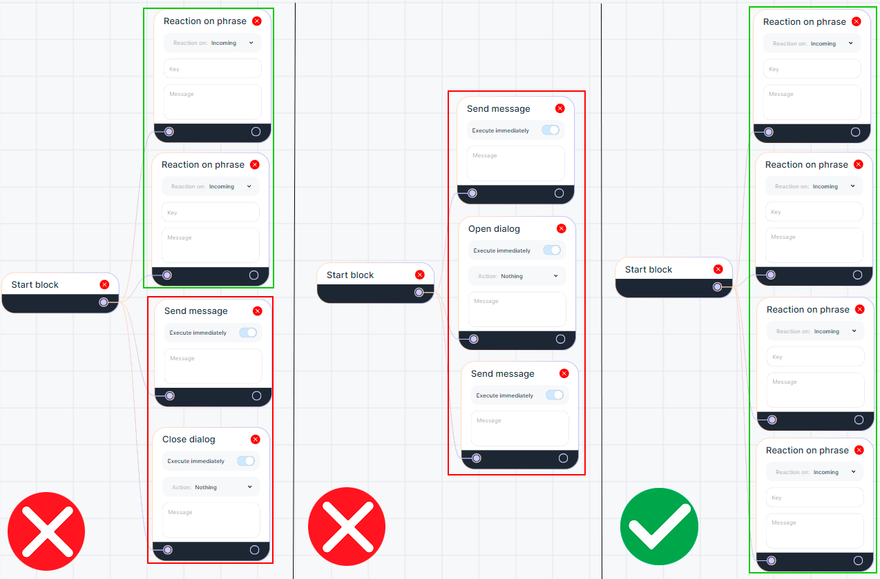 Except for the "Bot Subscription" and "Reaction to the Phrase" blocks, if they are outside the script, they will always be triggered when the condition specified in them is fulfilled.