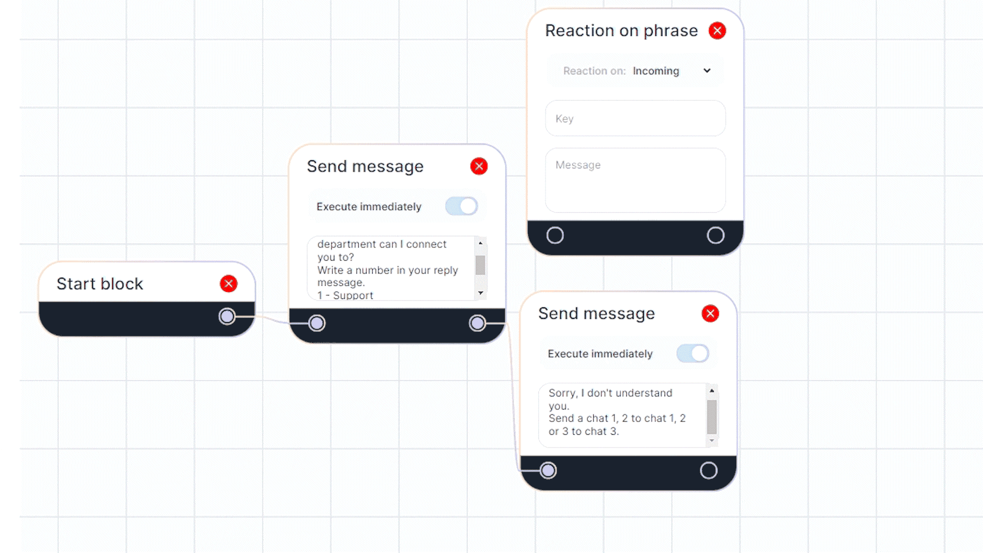 5. Create one more block "Send message". The message from this block will be sent if none of the keys work. Link it to the previous "Send Message" block.