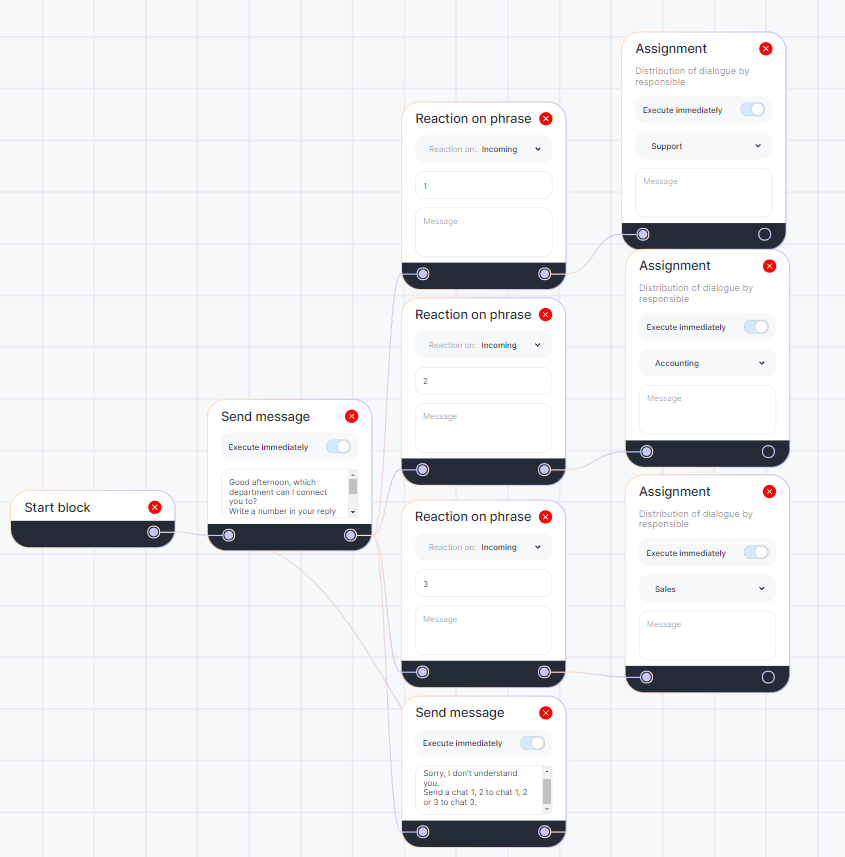 8. Create a block "Open a dialog" and connect it to all the " Assignment" blocks. Do this to notify the employee of an active chat.