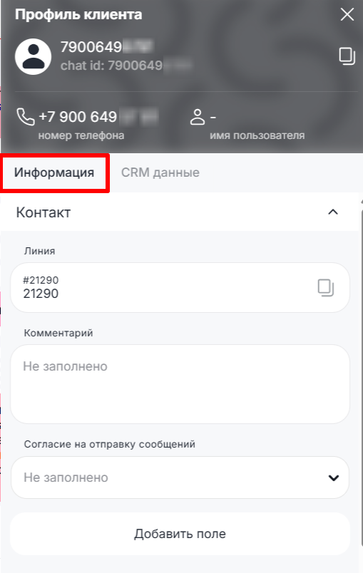 After selecting a dialog with the desired user, you can view the information collected by the bot about the user. To do this, click on the user's profile icon and select the "Information" section: