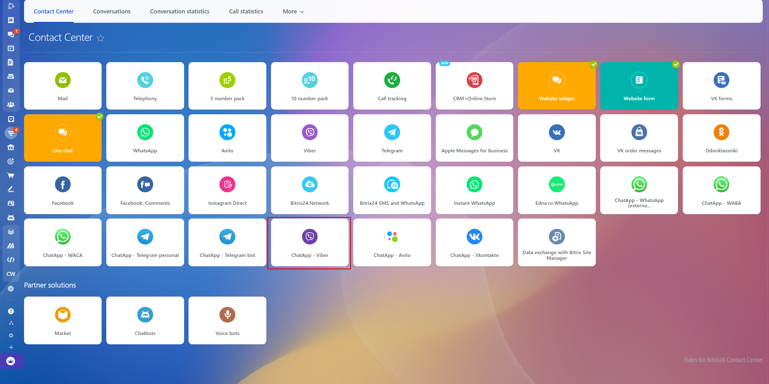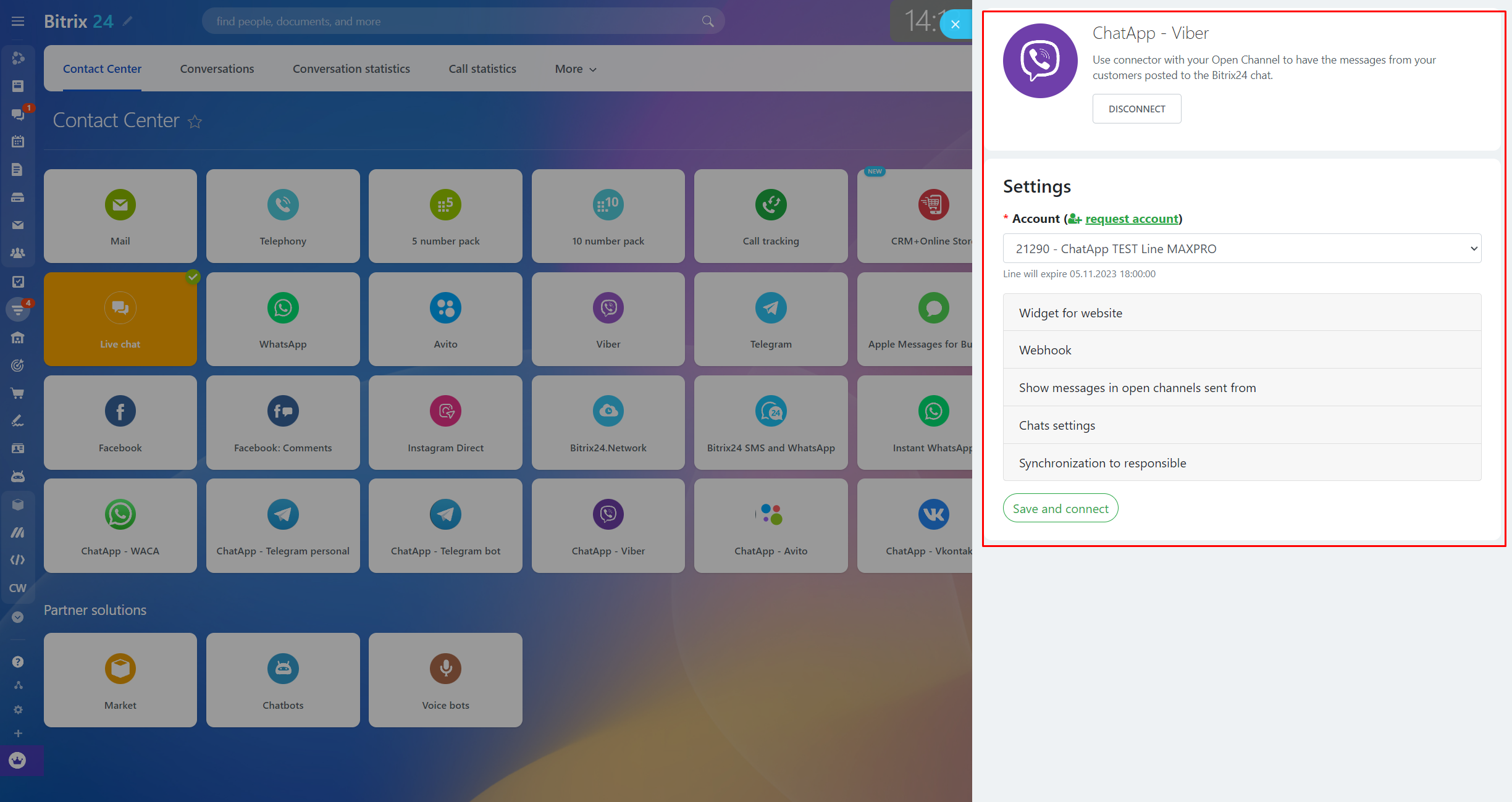 1. In “Contact center” section of Bitrix24 press “ChatApp–Viber” connector