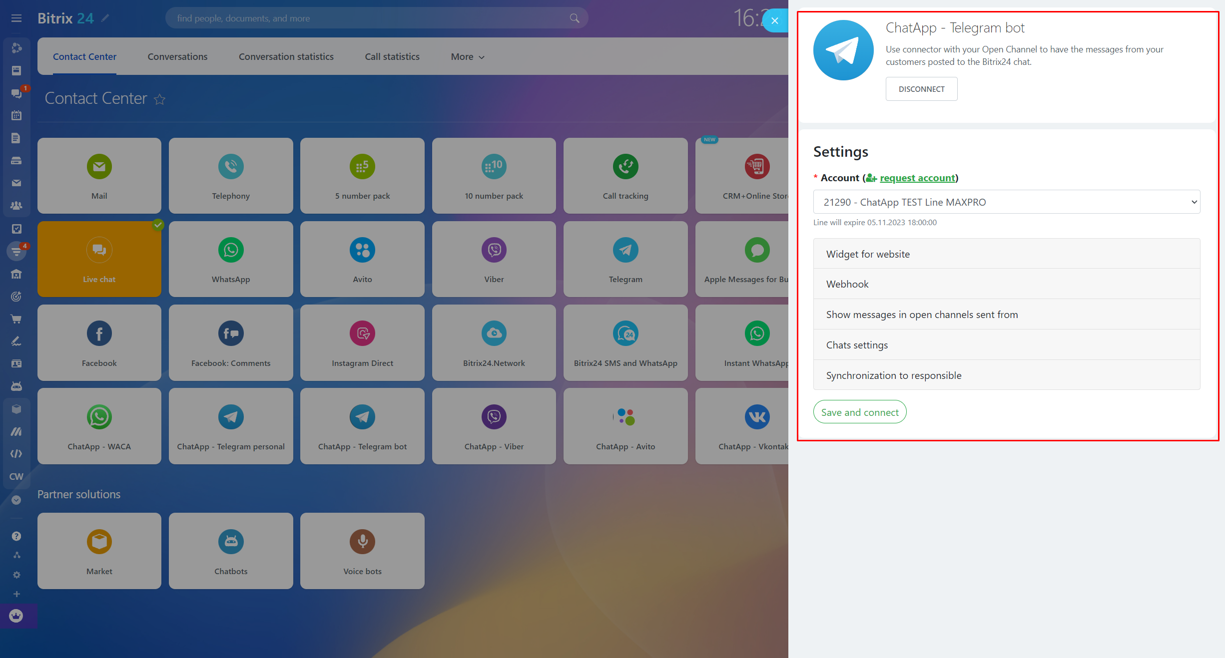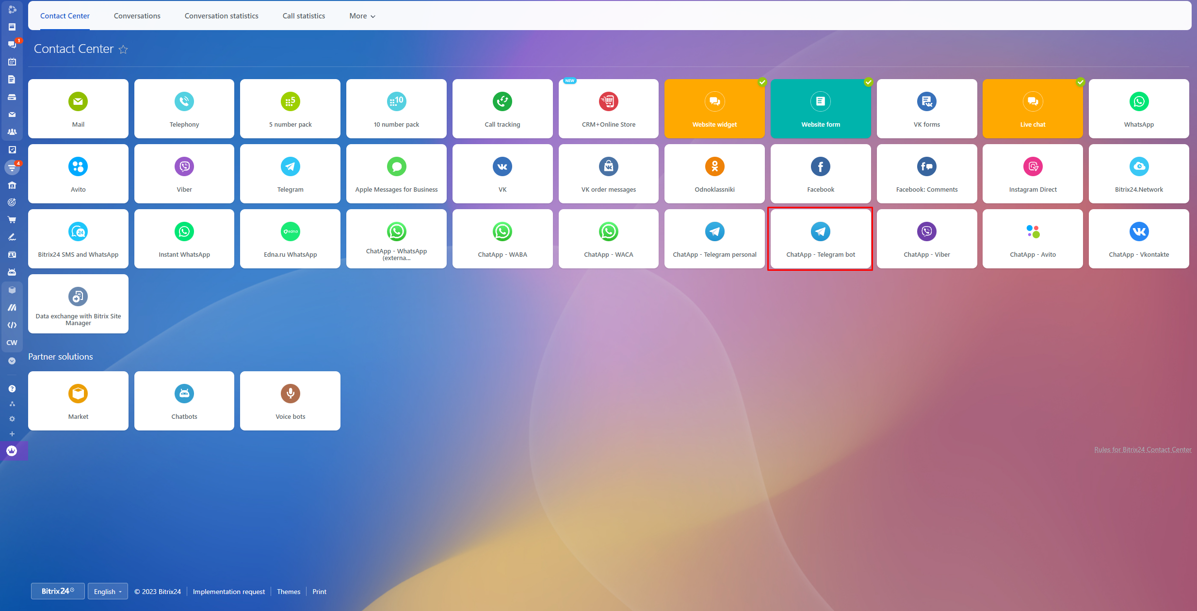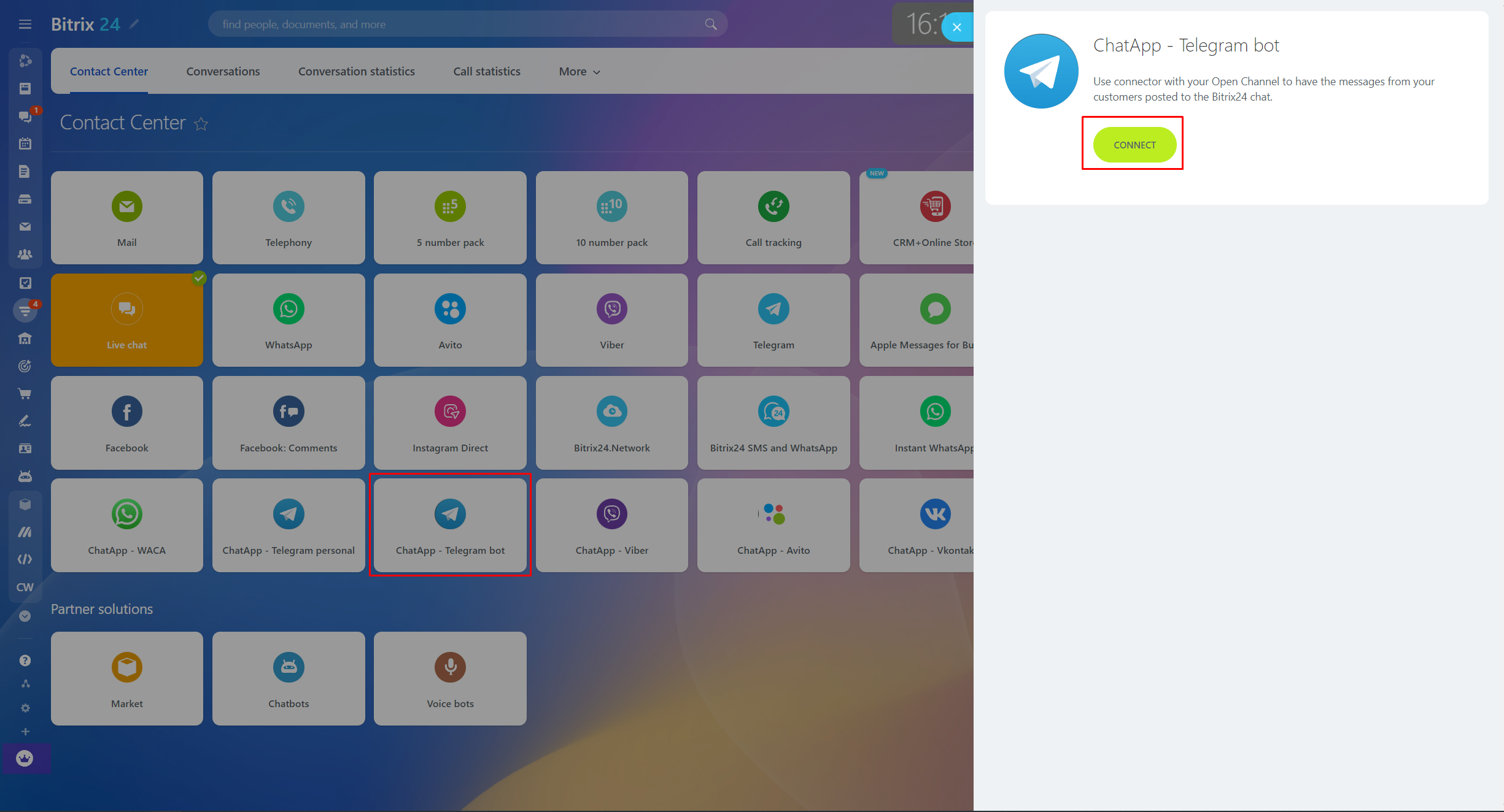 1. In the Contact Center section in Bitrix24, click on the connector - ChatApp - Telegram bot.