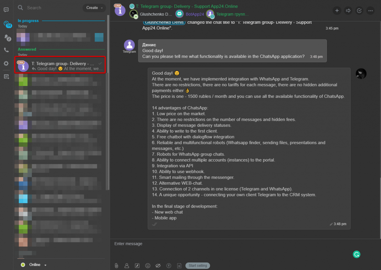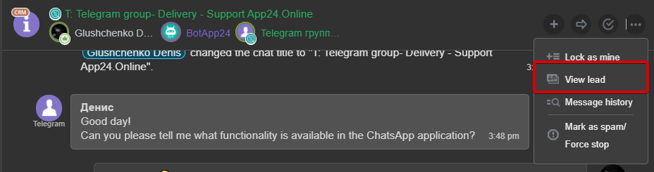 As a result, employees will be able to find the group in the CRM contacts and join the conversation.