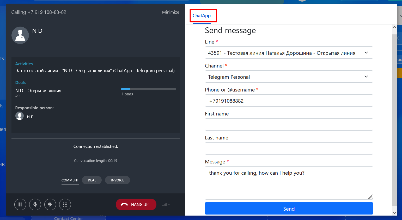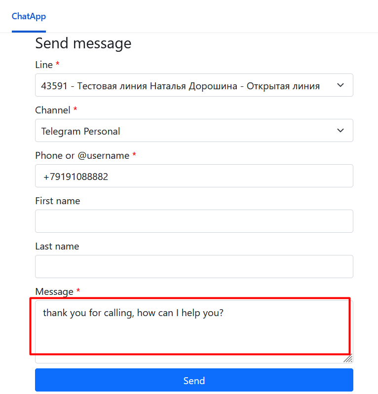 2. The ChatApp "Send Message" tab will open automatically with the call: