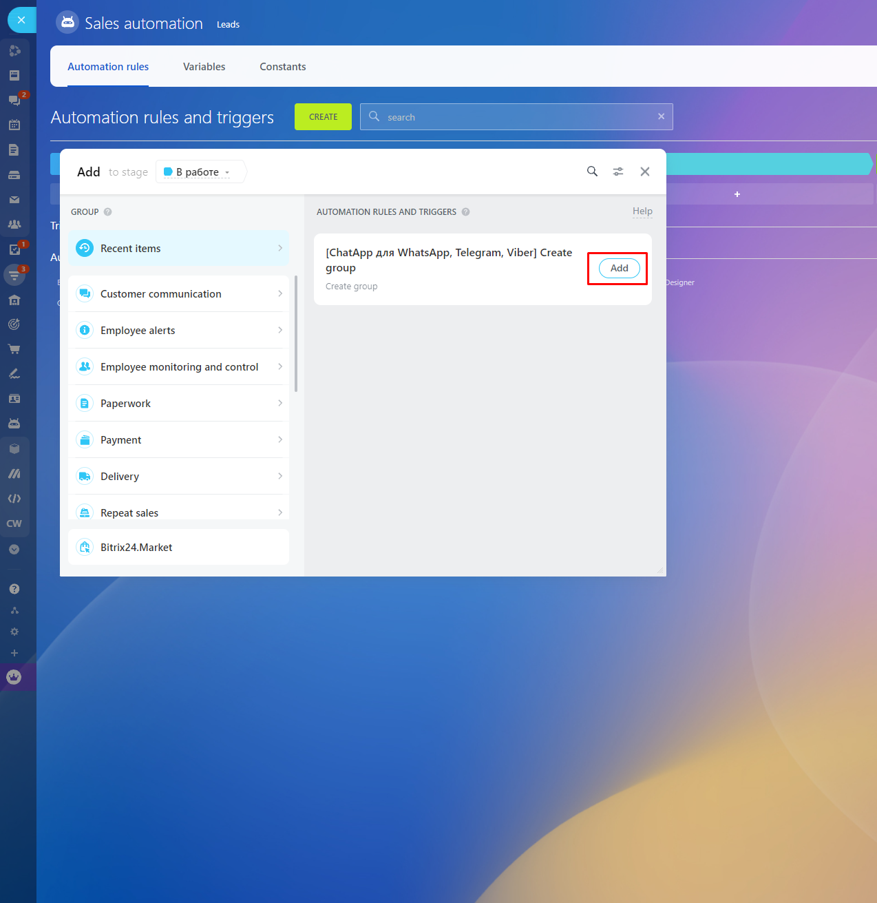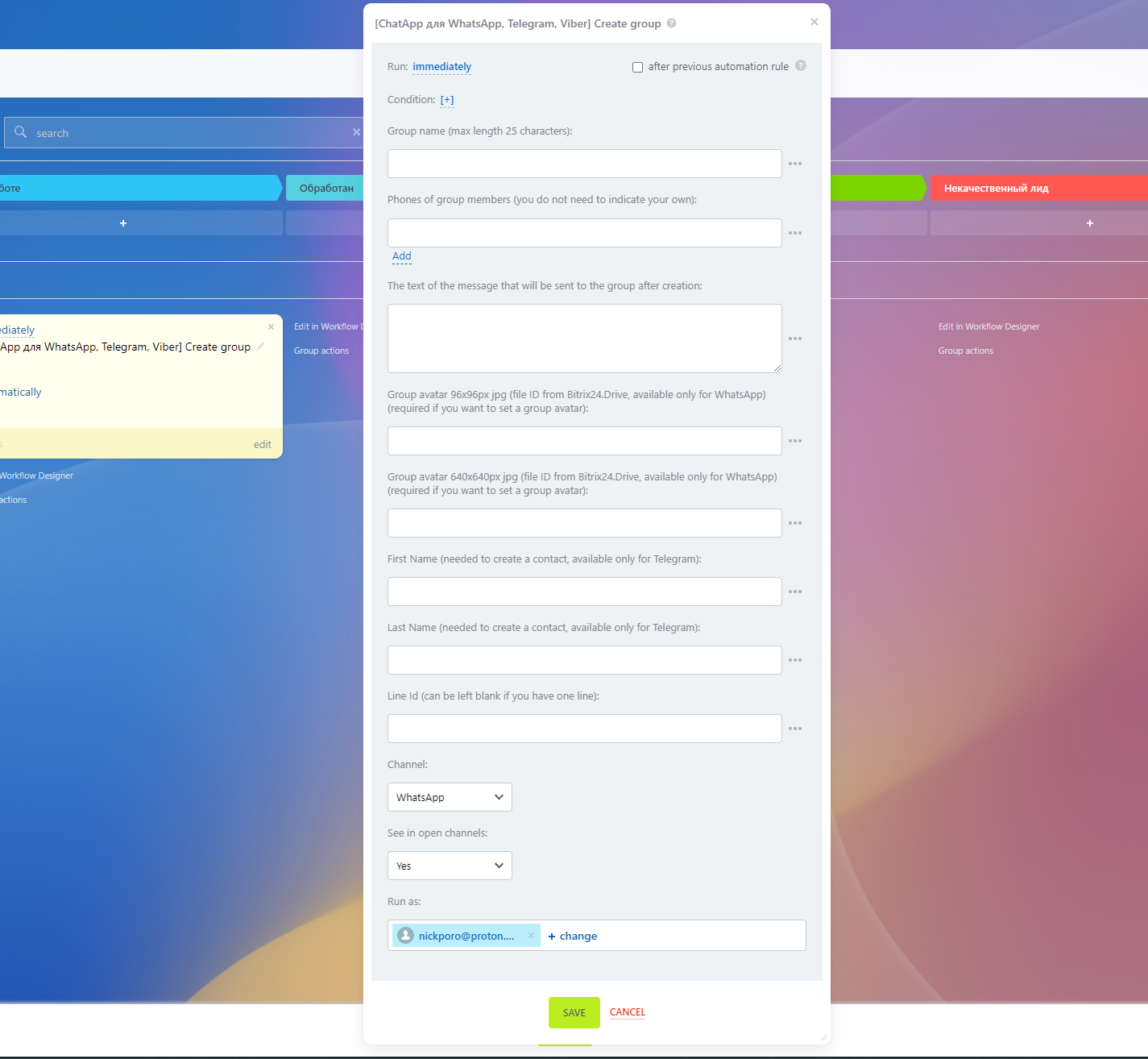 1. Add the [ChatApp] WhatsApp Create group automation rule for a deal. Use the standard procedure for setting up ChatApp automation rules.