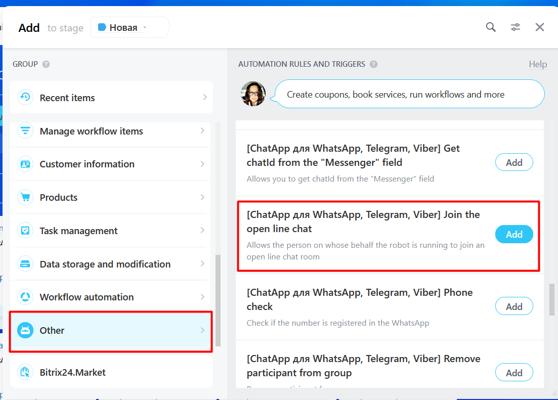 You can add ChatApp employees to Open Lines in Bitrix24 with the “Join Open Line Chat” robot. To add a robot:
