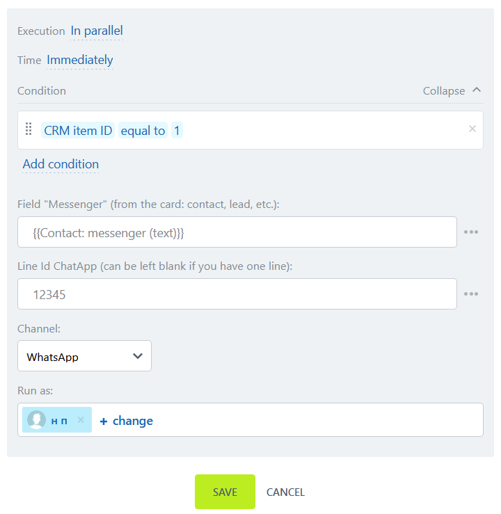 - Field “Messenger” - specify the messenger from the deal or lead card.