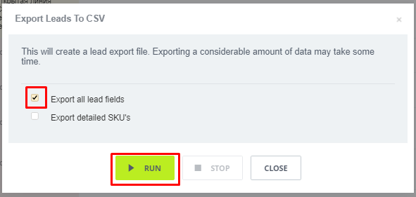 - In the pop-up window, check the box next to “Export all lead fields” and click on the “Run” button.
