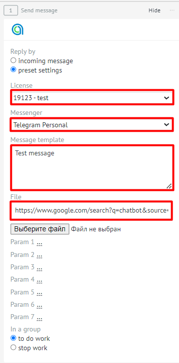 - We select sending messages according to preset settings, specify the information: