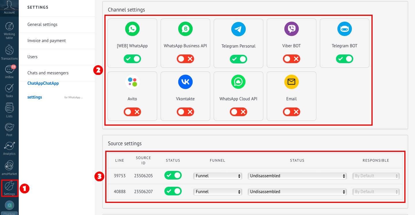 In amoCRM you can configure in detail the integration of messengers, lines, and also set access rights for any role and user.