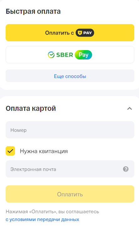 7. Откроется окно Тинькофф Кассы. Выберите способ оплаты и введите данные.