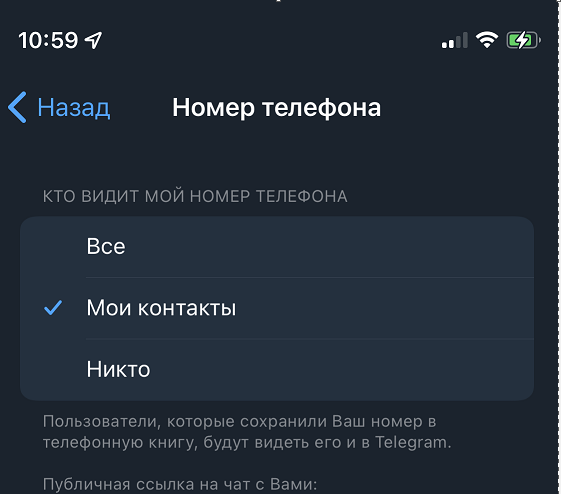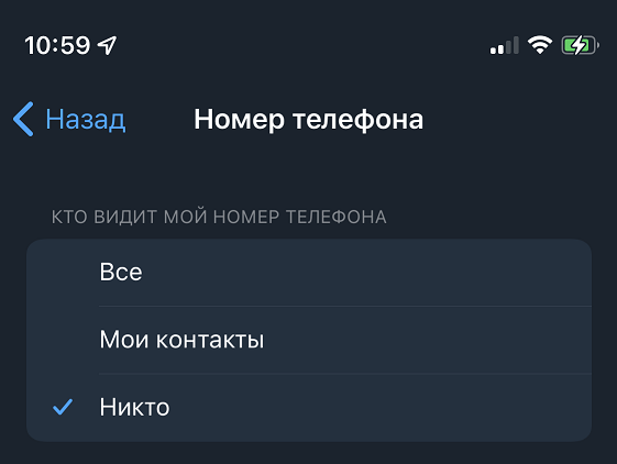 Вариантов доступности номера телефона в Настройках конфиденциальности Telegram всего три: