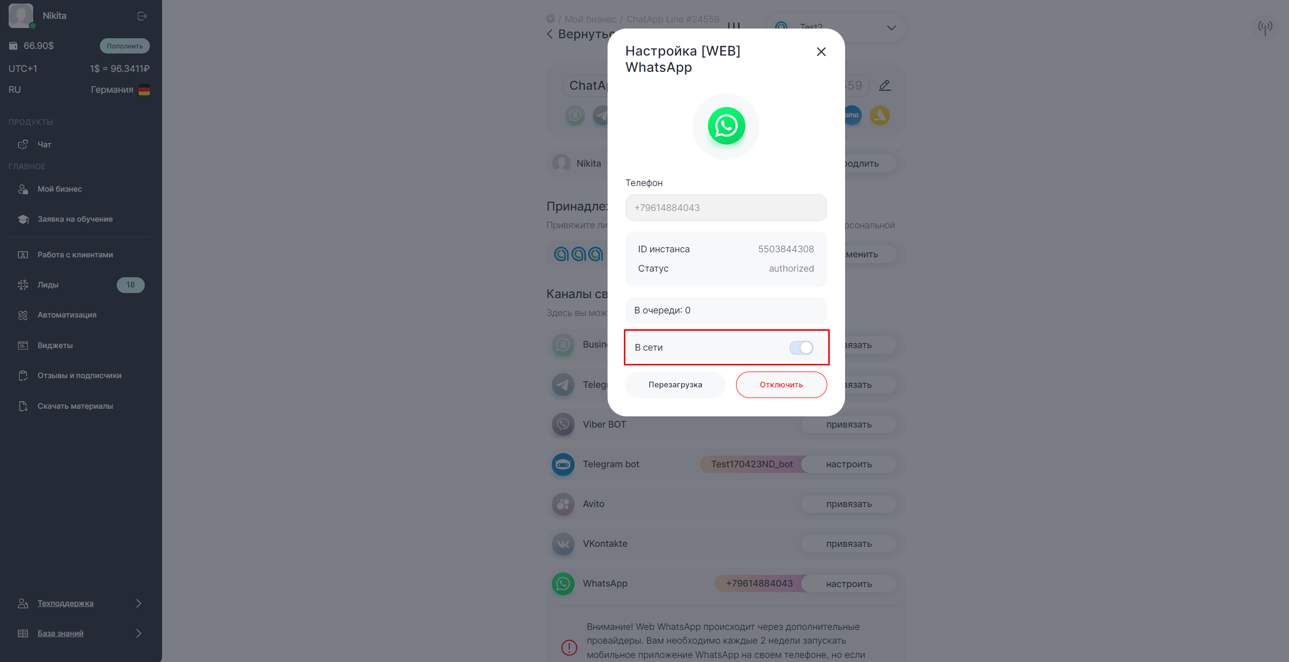 Рекомендуем подключать официальный WhatsApp Business API, который работает всегда стабильно.