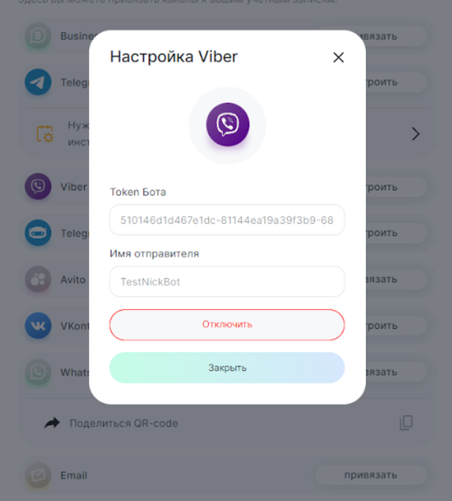 4. После успешного подключения отобразится имя отправителя и токен бота. Также появится возможность отключить Viber Bot.