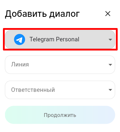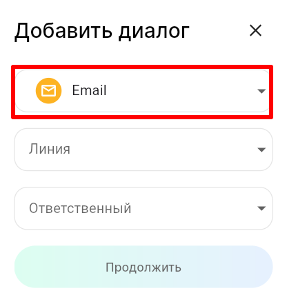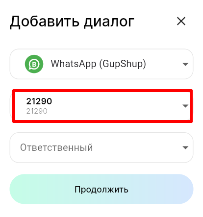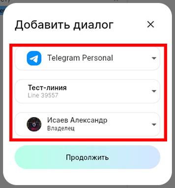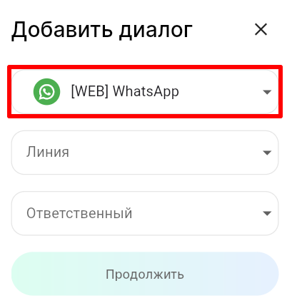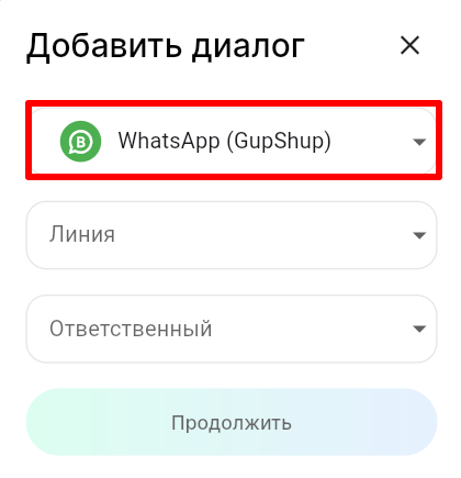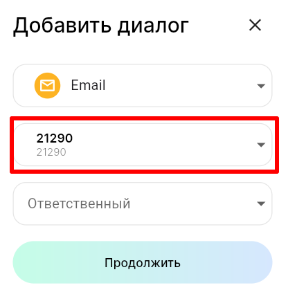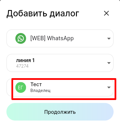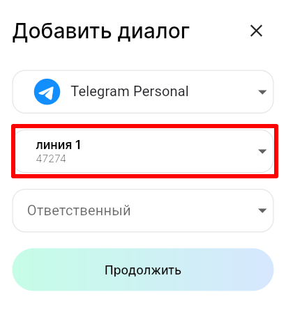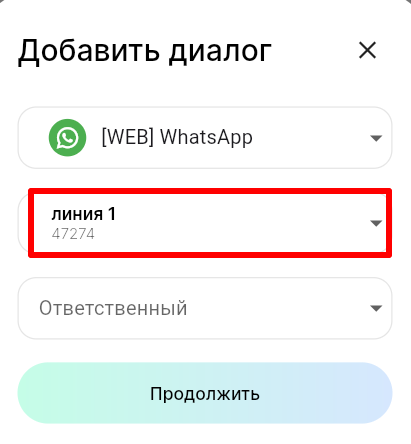 3. В поле «Линия» выберите линию, а в поле «Ответственный» выберите сотрудника, к которому будет прикреплен диалог с пользователем. Нажмите «Продолжить».
