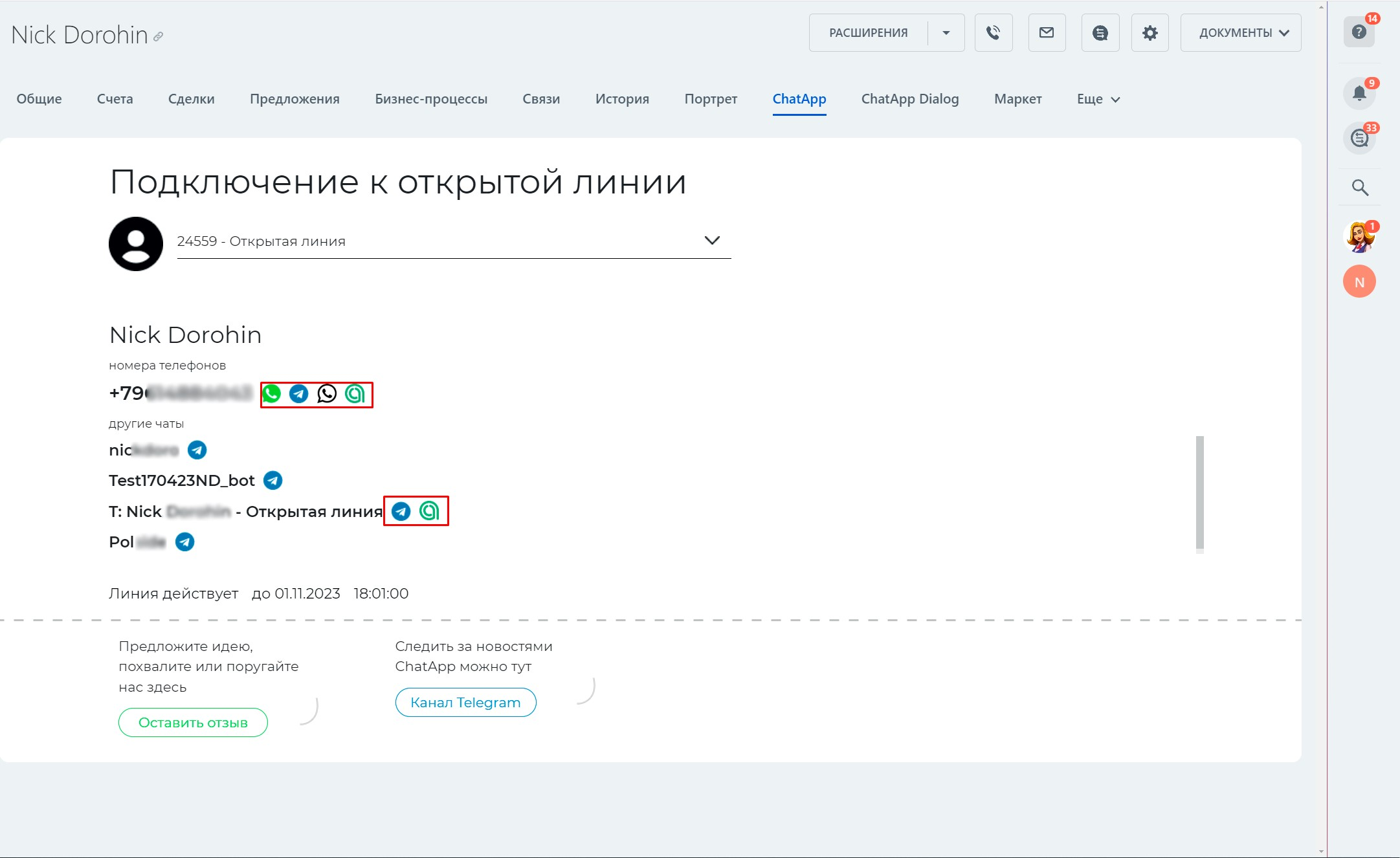 2. Таким образом, при переходе на вкладку Chatapp будет способ написать на Telegram Personal, а чат Открытой линии привяжется к сущности.