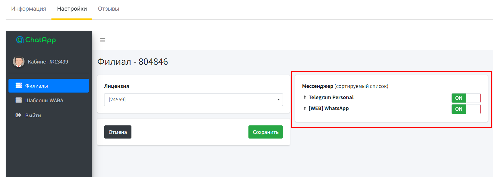 В настройках интеграции ChatApp можно изменить приоритетный мессенджер для отправки сообщений. Первый в списке мессенджер — самый приоритетный.
