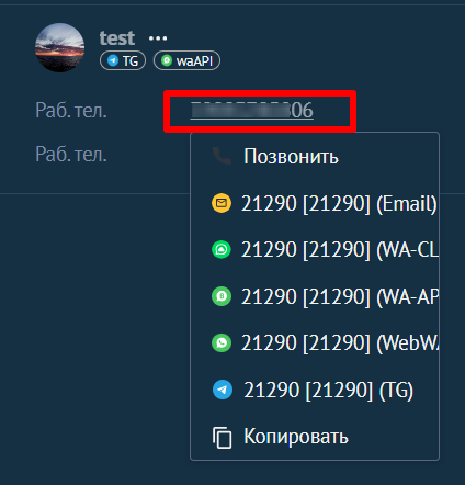 2. В карточке сделки нажмите на номер телефона клиента и выберите канал связи.
