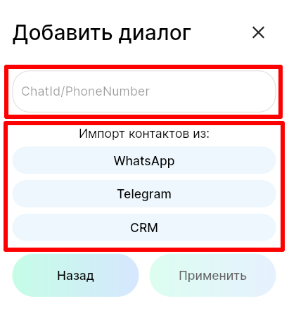 6. Введите номер телефона контакта, ChatID или импортируйте контакт из подключенного к линии канала связи.