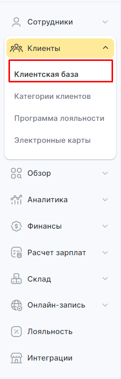 2. Перейдите во вкладку «Клиенты» в левом боковом меню и выберите «Клиентская база».
