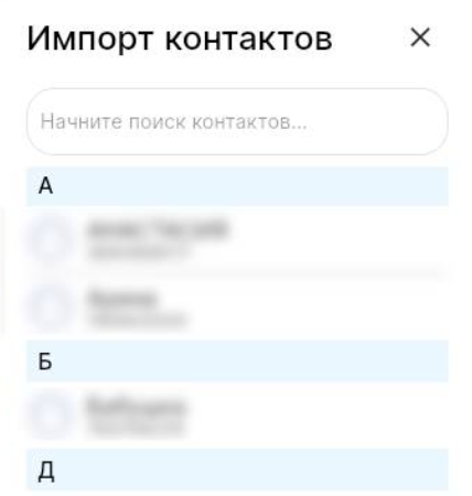 4. Выберите канал связи, из которого хотите импортировать контакт - Whatsapp, Telegram или CRM. В разделе «Импорт контактов» отобразятся доступные контакты.