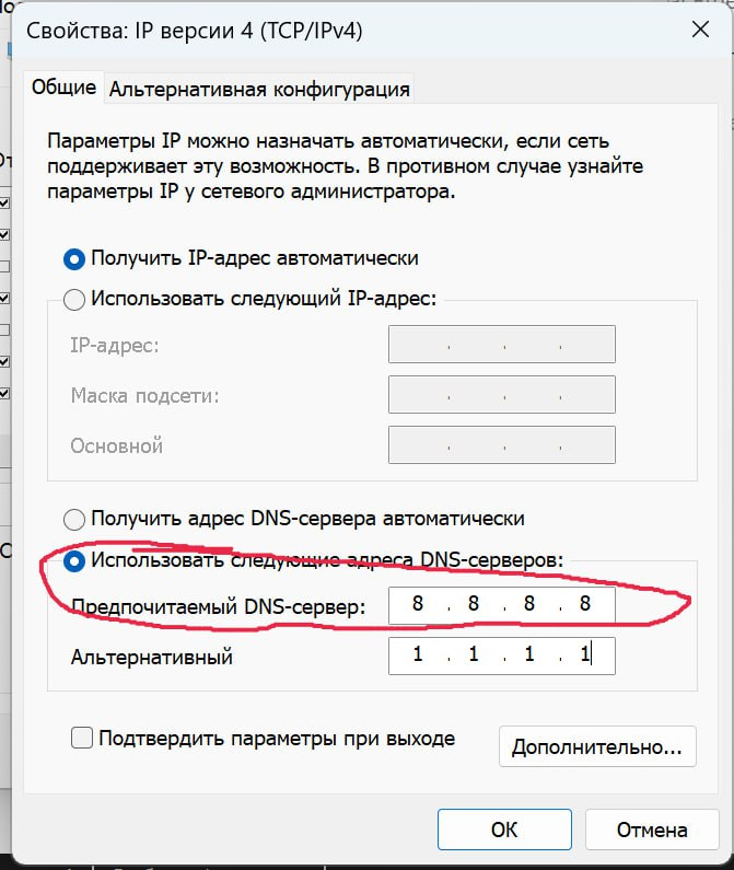 5) Нажмите “Использовать следующие адреса DNS-серверов”