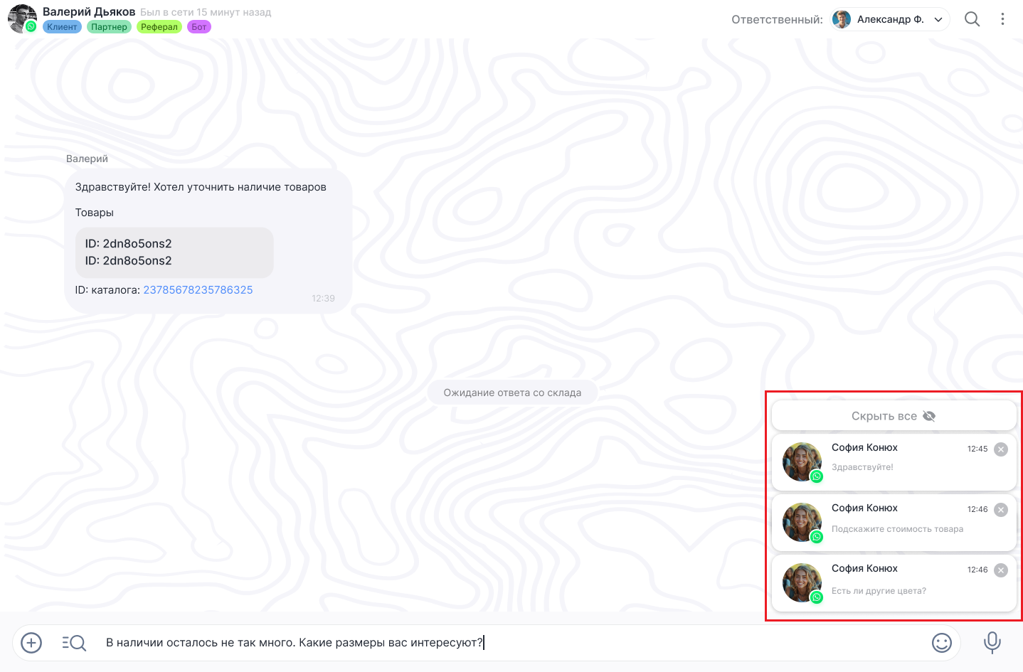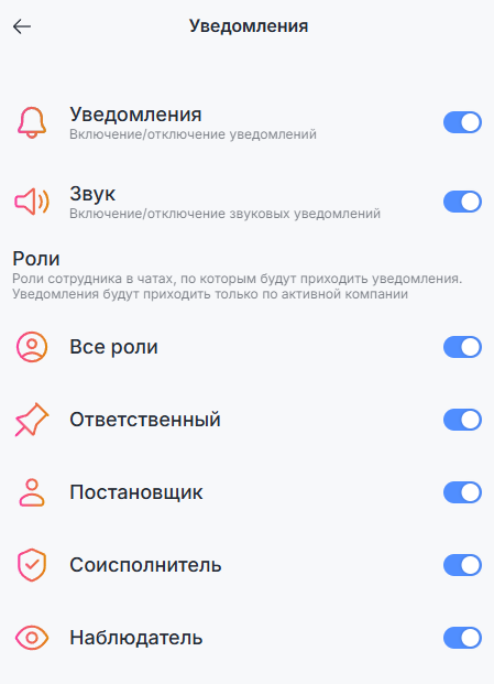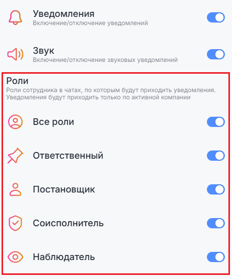Например, при выборе только роли «Ответственный» уведомления будут приходить именно по тем чатам, где есть эта роль.