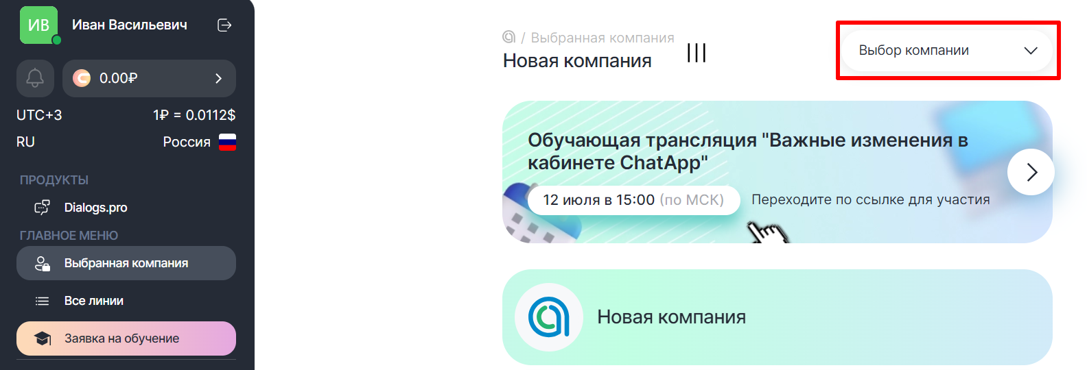 2. Выберите нужную компанию, кликнув по «Выбор компании» в правом верхнем углу.
