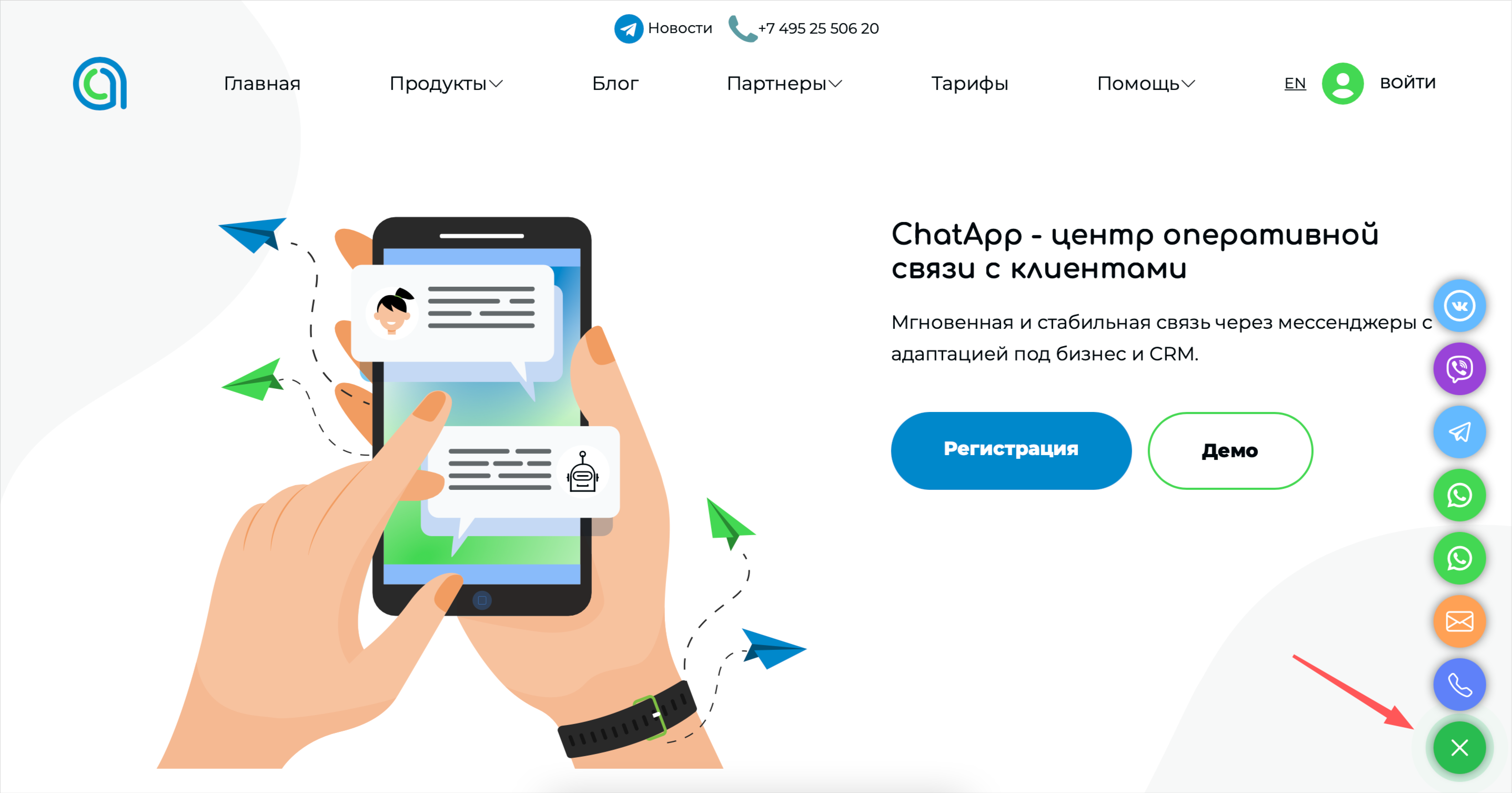 Виджет ChatApp — это сервис, объединяющий все способы связи в одном элементе на сайте. После его подключения, клиентам будут доступны все мессенджеры.