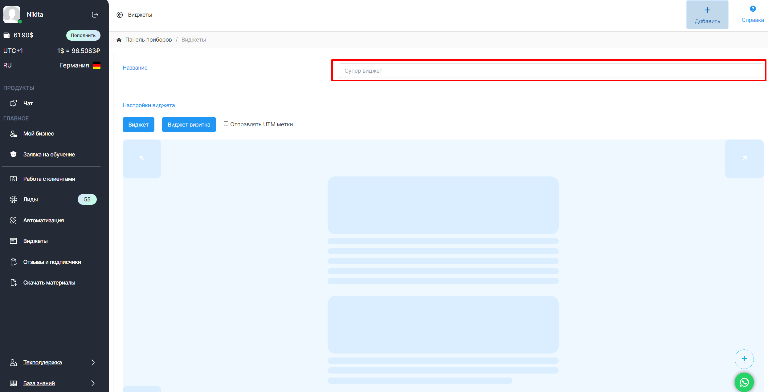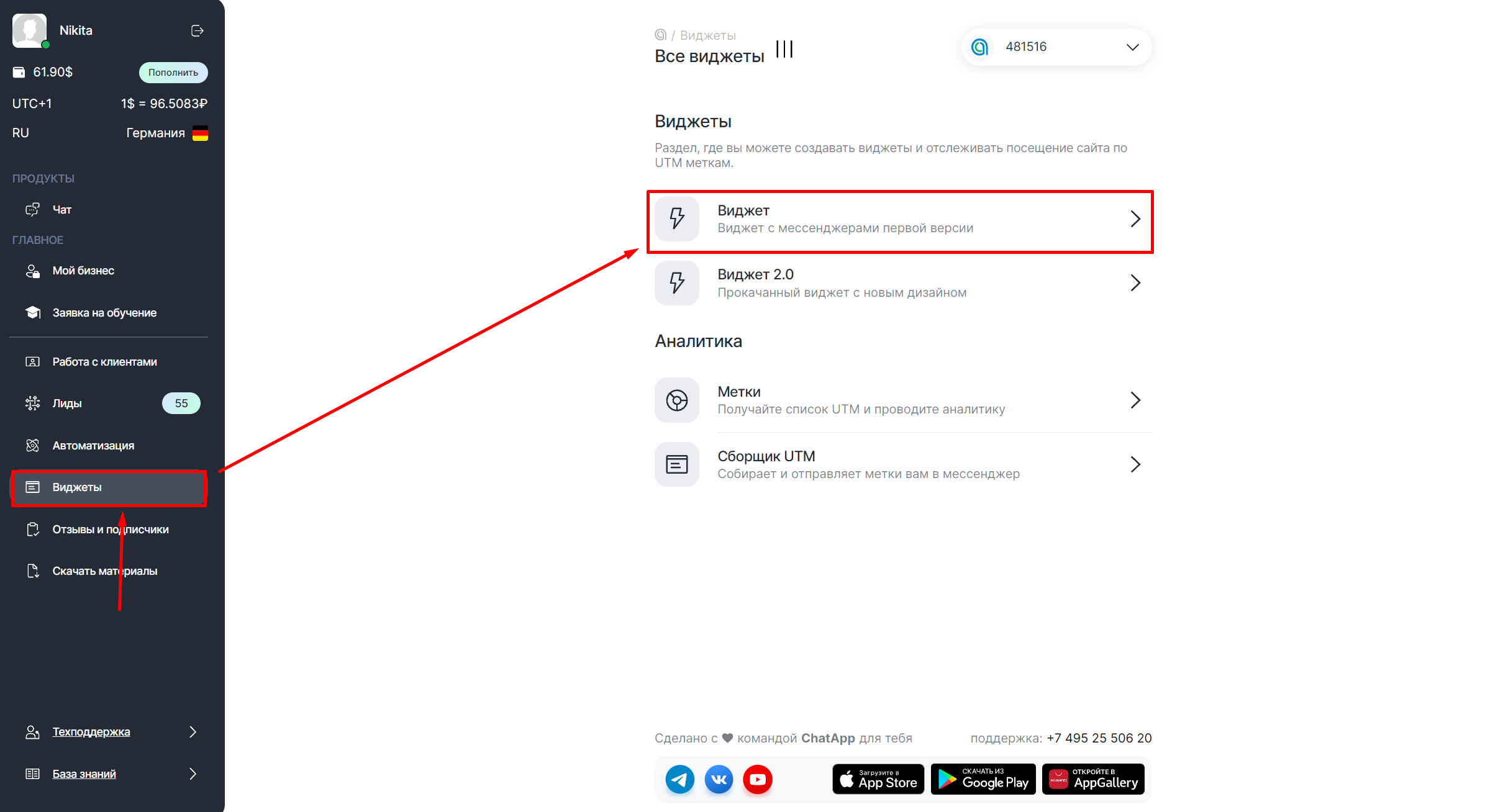 1️. В Личном кабинете ChatApp выберите «Виджеты» в левом боковом меню, и нажмите «Виджет».