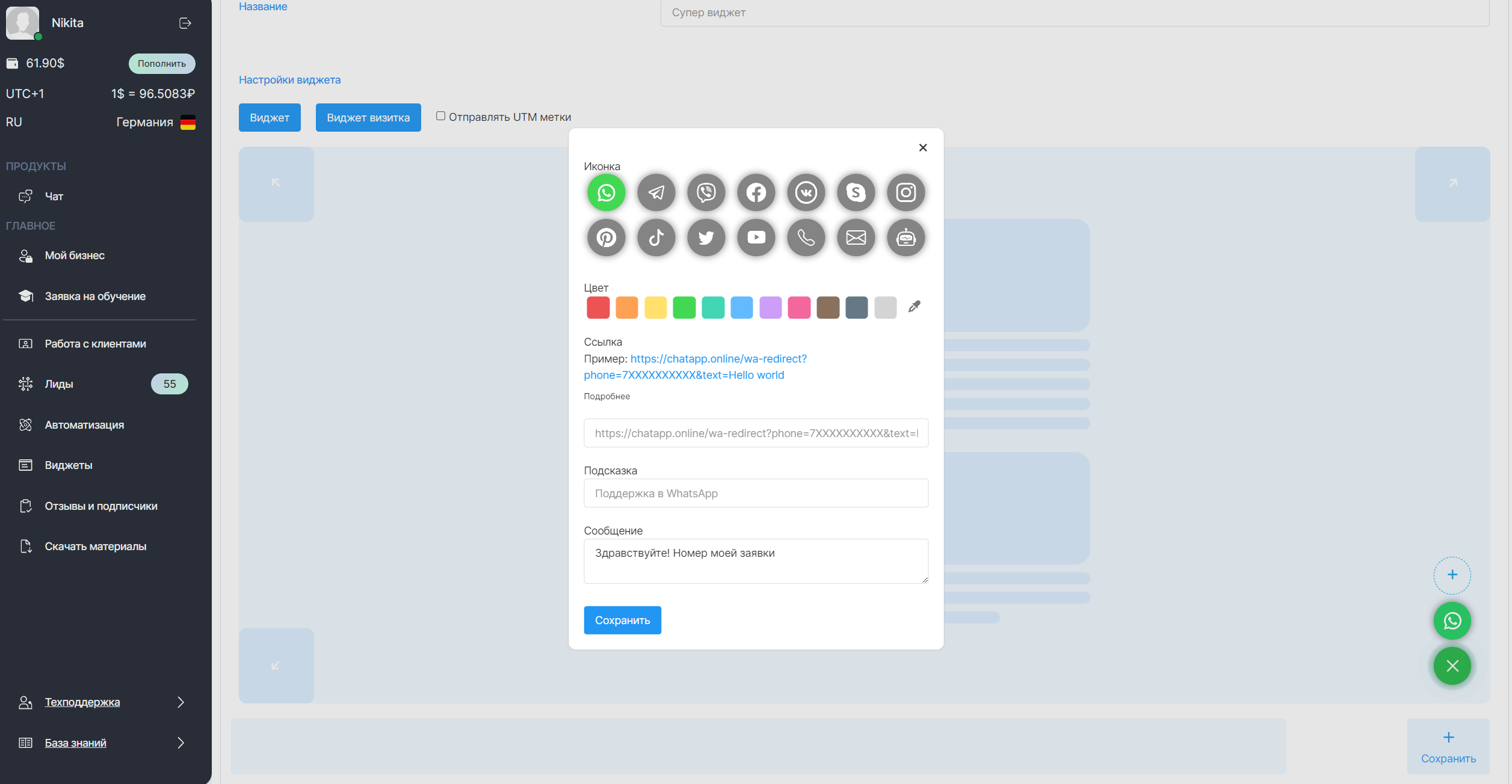 ► Вы можете внести в виджет необходимые изменения  — добавить или удалить мессенджеры, поменять цвета иконок или изменить подсказки, а затем нажать на кнопку «Сохранить».