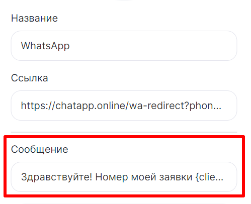- Чтобы получить номер визита, добавьте параметр {clientId} в сообщение. Пример: «Здравствуйте! Номер моей заявки {clientId}».