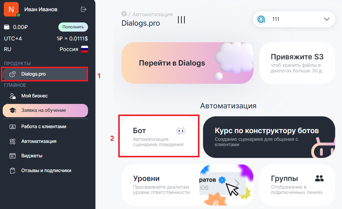 2. В ChatApp Личном кабинете зайдите в раздел «Dialogs.pro» либо «Автоматизация» и выберите плашку «Бот».