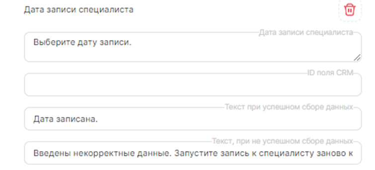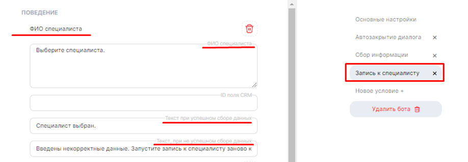• В окнах «Текст, при не успешном сборе данных» напишите, что данные введены неправильно, и подскажите клиенту как запустить запись по новой. Например: «Введены некорректные данные. Запустите запись к специалисту заново написав Старт.»