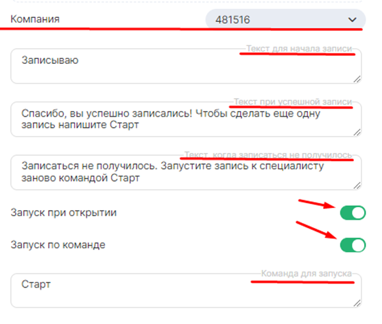 • В окне «Текст при успешной записи», напишите, что клиент успешно записался на прием и как клиент может начать новую запись. Например: «Спасибо, вы успешно записались! Чтобы сделать еще одну запись, напишите Старт.»;