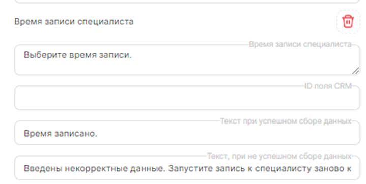 • В окнах «Текст при успешном сборе данных», напишите, что клиент правильно выбрал услугу, специалиста, время или дату;