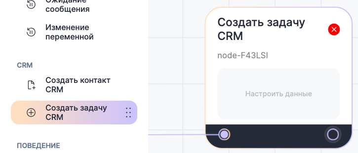 2. Из меню слева возьмите блок «Создать задачу CRM» и перенесите на рабочую область;