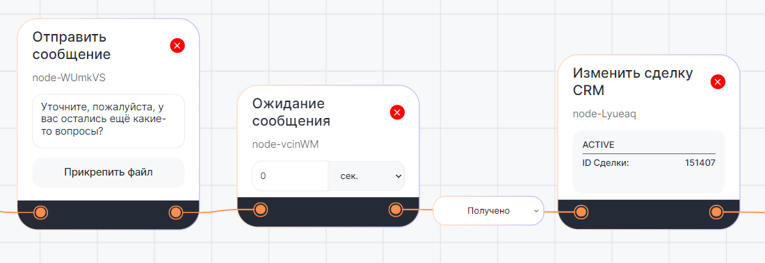 В диалоге бота с клиентом блок «Изменить сделку CRM» автоматически изменяет карточку сделки в CRM-системе.