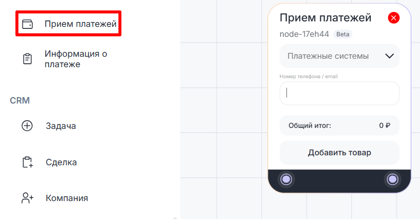- Добавьте блок «Прием платежей» на рабочую область в Конструкторе ботов.