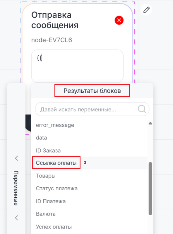 7. Чтобы отправить клиенту ссылку на оплату, добавьте блок «Отправка сообщения», введите двойные фигурные скобки «{{», откройте раздел «Результаты блоков» и выберите результат «Ссылка оплаты».