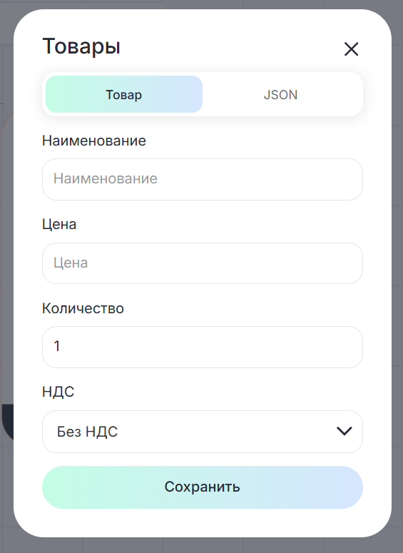 Во вкладке «JSON» можно ввести параметры товара в формате json.
