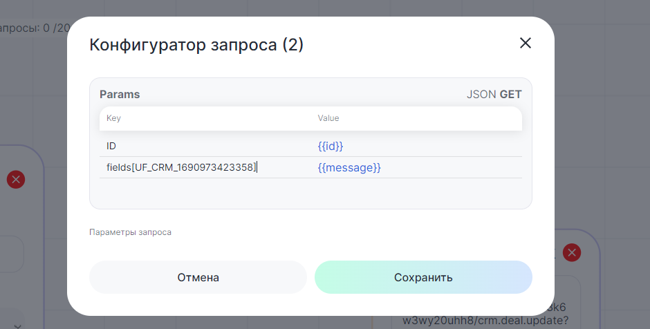 - В «key» введите «ID» сделки. И id поля в формате fields[UF_CRM_**********], чтобы Битрикс24 понимал, какую карточку и какое поле нужно изменить.