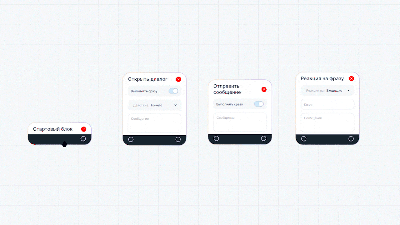 Блоки в «Поведении» — самодостаточные. Их не нужно связывать с другими. Если блоки «Автозакрытие диалога» и «Нерабочее время» находятся в рабочей области, они влияют на весь сценарий в целом.