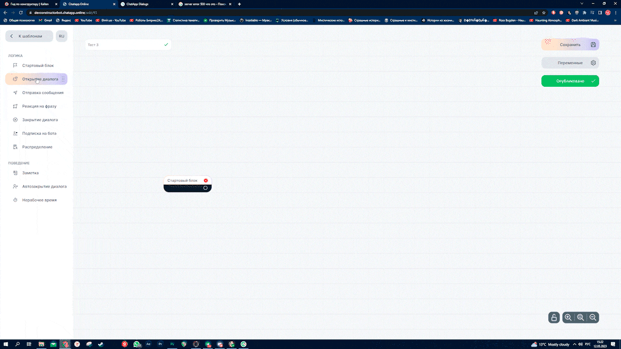 Вы вошли в редактор — попробуйте создать своего первого бота.  Учитывайте правила сохранения, а разобраться с функционалом блоков помогут статьи: